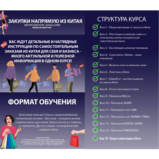 Вас ждут детальные и наглядные инструкции по самостоятельным заказам из китая для себя и бизнеса — много актуальной и полезной информация в одном курсе!
