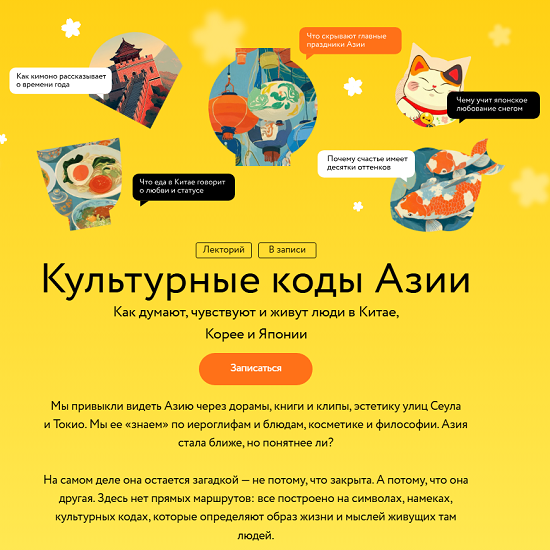 Лекторий «Культурные коды Азии» — шанс увидеть, как «устроены» Япония, Корея и Китай изнутри. Не снаружи, не глазами туриста, а через логику мышления, чувств, традиций. Эти лекции для тех, кто не просто интересуется Востоком, а хочет по-настоящему его понять.