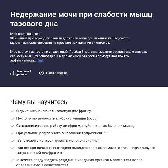 Курс предназначен: Женщинам при периодическом недержании мочи при чихании, кашле, смехе. Мужчинам после операции на простате при наличии симптомов. Курс состоит из тестов и упражнений. Пройдя 3 теста вы сможете оценить свою степень слабости мышц тазового дна и в дальнейшем эти тесты помогут Вам понять эффективность упражнений. Примерное время прохождения тестов 15 мин. Затем можно приступать к упражнениям их всего 10, просмотр видео займёт 15 мин. Примерное время выполнения всех упражнений 45 мин.