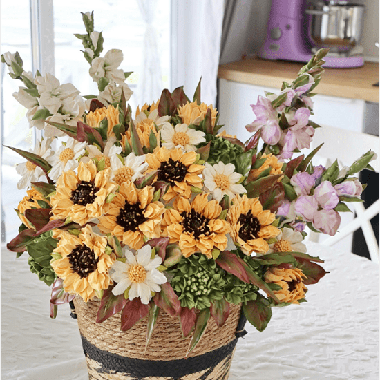 Букет с зефирными цветами: подсолнухами, гортензией, ромашками и гладиолусами — осенний, яркий и праздничный!